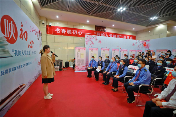 图片来源:中国铁路南昌局集团有限公司 书香映初心 故事见真情 “红米饭那个南瓜汤哟咳罗咳,挖野菜那个也当粮罗咳罗咳……”在欢快的旋律中,一场别开生面的分享会正在南昌车站三楼会议室举行。 4月23日,来自赣闽两省38名党员群众正在参加中国铁路南昌局集团公司“书香映初心--我的入党故事”分享会。此次分享会以“书香映初心”为主题,让大家在轻松愉悦的氛围中学习党史,坚守初心,砥砺前行。