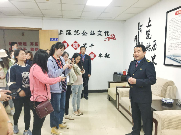 上饶站党总支书记陈卫红向记者介绍火车站。图片来源:中国铁路南昌局集团有限公司 陈卫红说,“2014年第五代高铁站房启用后,上饶正式迈入了高铁时代。从上饶坐高铁到上海只要2小时50分钟,时速350公里,这种速度刚参加工作的时候我想都不敢想。” 如今,上饶火车站已成为上饶市热门网红打卡地,车站外形象一艘扬帆起航的船,站内的设备设施也更加完善,和谐号动车已经在车站停靠,许多市民都相约到车站或一睹动车风采或兴奋地乘坐动车出行。