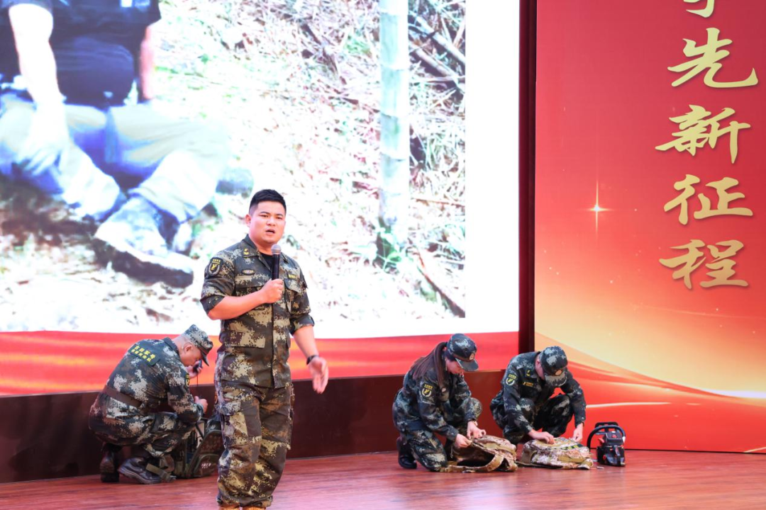 2020年度全国“最美退役军人”、凯发k8市鼓楼区三坊七巷消防救援站副站长张天水作宣讲 现场气氛庄重而热烈,榜样们的感人故事引发全场深切共鸣,掌声多次响彻会场。活动中,集美大学沐音合唱团献唱《红旗飘飘》《如愿》等歌曲,用歌声传递爱国情怀,为宣讲增添了浓厚氛围。